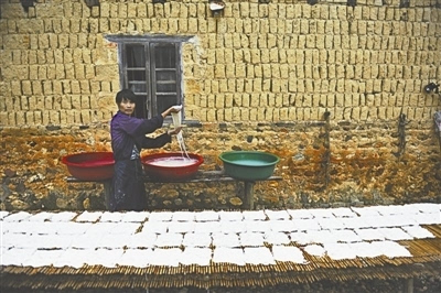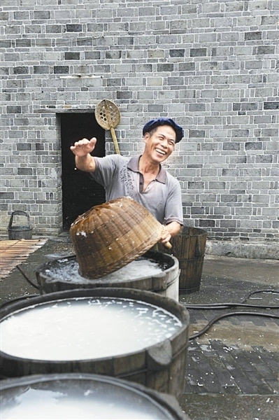 和許多村莊一樣,現(xiàn)在龍下的年輕人都外出務工,他們的父母則留在家中。只要天氣允許,夫妻二人都會半夜起床做米粉,這已成為他們生活的常態(tài)。也正是靠著做米粉的收入,龍下人將孩子養(yǎng)大成人。村民嚴牛崽自豪地介紹,他培養(yǎng)兩個孩子讀完了研究生,現(xiàn)在還有兩個孩子在縣城讀高中。雖然因家中蓋樓房還欠著債,但他每天依然樂呵呵的。他也請過幫工,但沒干多長時間人家就不愿再來了。他說每年下半年最累,因為此時不多做一些,到年底就無貨可供了。