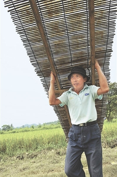 嚴林根扛著米粉到屋前晾曬。