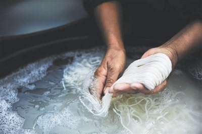 女人用手將米粉一扎扎撈起。