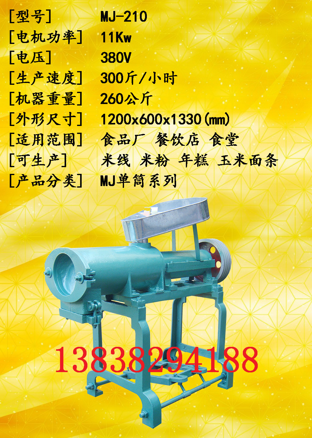 小型單筒米線機(jī)是我廠專為南方客戶生產(chǎn)的一款米線機(jī),機(jī)器特點(diǎn)是體積相對(duì)來(lái)說(shuō)比較小巧,所以整機(jī)占地面積不需要太大,其次是整機(jī)價(jià)格便宜,再由就是可達(dá)到一人同時(shí)看守幾臺(tái)機(jī)器,小型米線機(jī)機(jī)筒采用加厚設(shè)置,有效防止天氣寒冷帶來(lái)的溫度不穩(wěn)定因素。本廠生產(chǎn)的小型米線機(jī)主要分為100型單筒米線機(jī)、150型單筒米線機(jī)、200型單筒米線機(jī)、210型單筒米線機(jī),產(chǎn)量分別為50斤、100斤、200斤、300斤。
